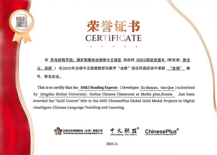 The course HSK5 Reading Express, co-developed by Qingdao Binhai University and the Russian Media Plus Online Chinese Classroom, won the "Golden Course" Award in the 2025 Global Chinese Language Alliance Digital & Intelligent Teaching "Gold Medal" Program Selection.
