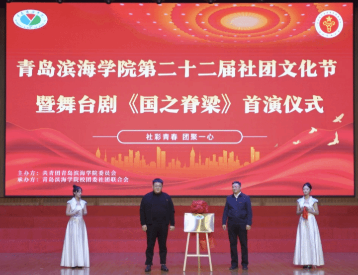 On November 20, the nation's first national-level offline stage play practice base for the project "Pillars of the Nation" was inaugurated at Qingdao Binhai University. The base was jointly awarded by the National Institute of Education Sciences, the Institute of Curriculum and Textbook Research under the Ministry of Education, and the Central Audio-visual Education Center. That same evening, the offline stage plays "Qian Xuesen" and "Huang Lingyi," part of the "Pillars of the Nation" series, successfully premiered at the university.