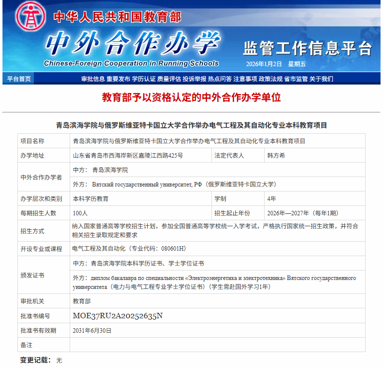 On December 31, 2025, upon approval by the Ministry of Education, the undergraduate education project in Electrical Engineering and Automation, jointly organized by Qingdao Binhai University and Vyatka State University (Russia), was officially approved. Enrollment is set to commence in the fall semester of 2026. This marks Qingdao Binhai University’s first Sino-foreign cooperative education project.